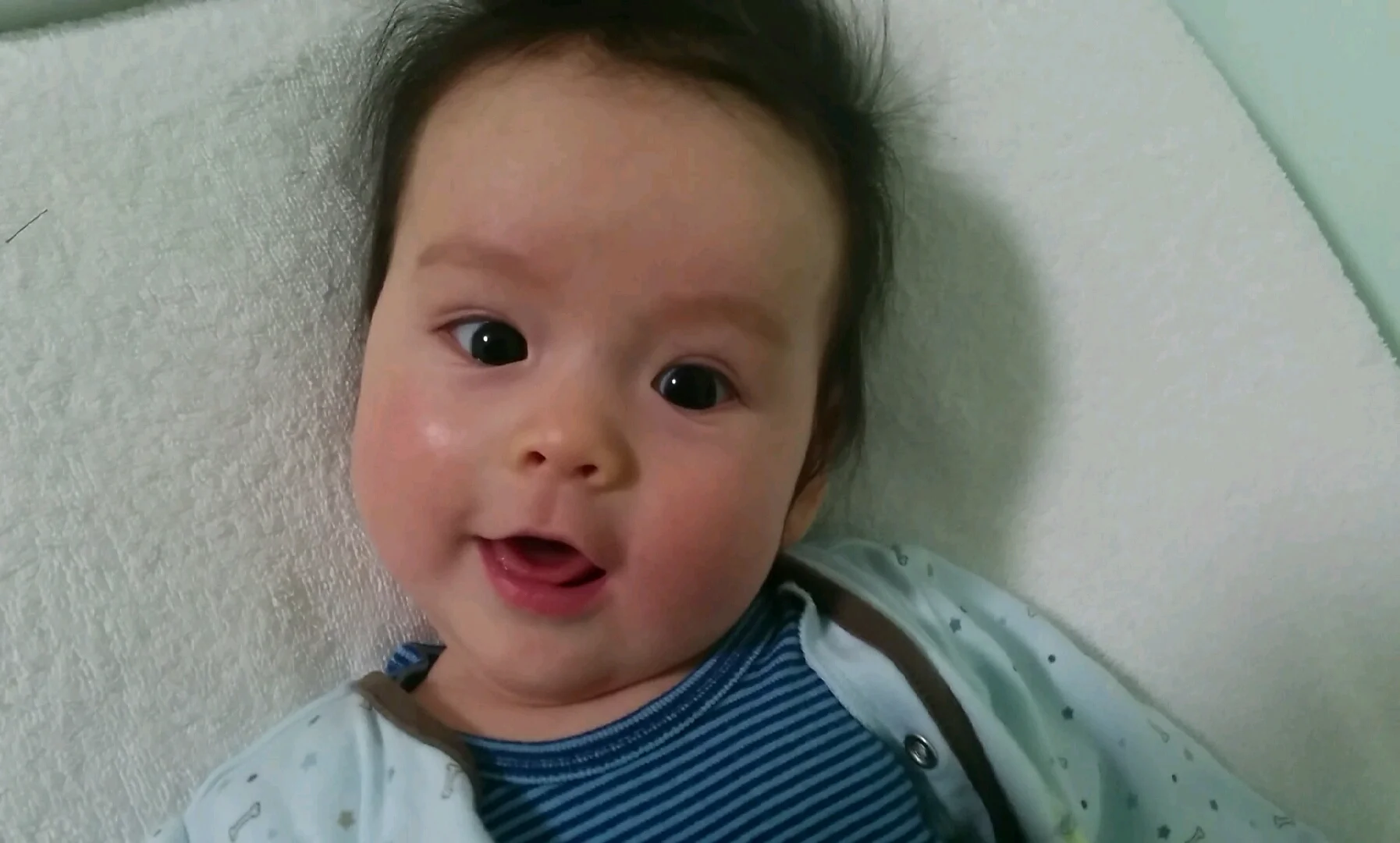 Up to fourteen pounds today! In Britain they'd say I weigh one stone, which makes me all the more grateful that I'm not in Britain. The smooth-talking pediatrician said that my weight has improved to above the twentieth percentile of babies my age, so I've upgraded from ballerina to jockey. My enormous head still tips the scales above the eightieth percentile, but check out the adorable expressions I can make with it now: